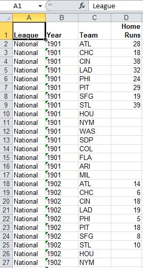 and Select the column with that team's data, giving it the same name each time ("Home Runs" in this example