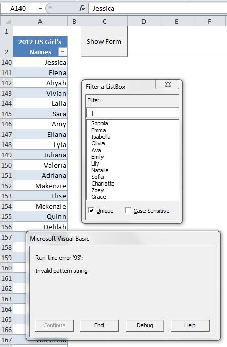 Since posting about filtering a listbox, I’ve been thinking a lot about VBA’s Like operator. I realized I could type in filters such as ‘[4-7]#‘ which matches two-digit numbers between 40 and 79. I raced to my computer to try it out, typed the opening bracket and was halted in my tracks: