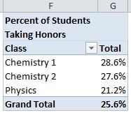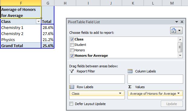 We can now pivot on the Honors for Average column. In the pivot table below, Class is in the Row area and the Value field is Honors for Average. “Show Values As” is set to the default of “No Calculation” and, most important, “Summarize Values By” is set to “Average.”